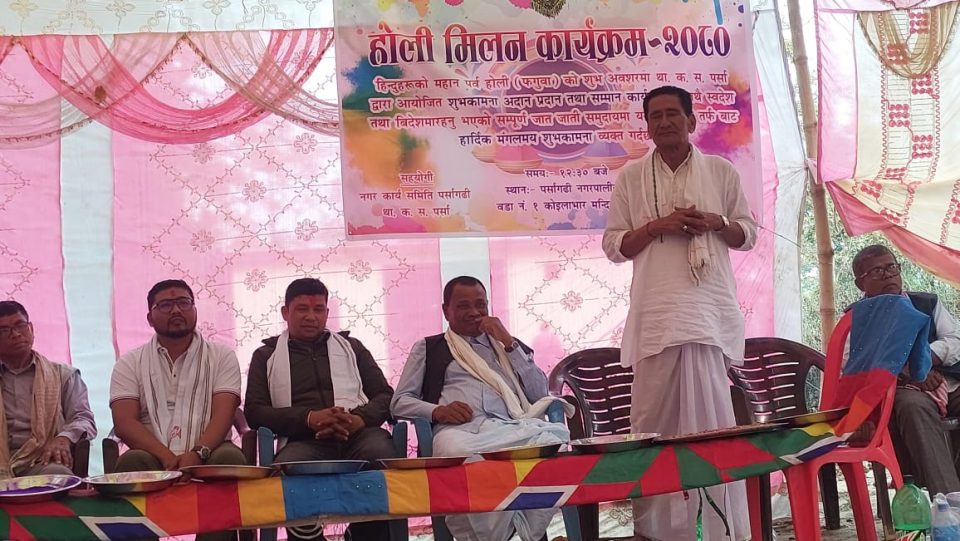 पर्सा १० चैत थारू कल्याणकारणी सभा पर्सा द्वारा होलि मिलन कार्यक्रम सनिबार सम्पन्न भएको छ।हिन्दुहरुको महान पर्व होलि फगुवाको सुभ अवसरमा था.क.स.पर्सा द्वारा आयोजित शुभकामना आदानप्रदान तथा समान कार्यक्रमको आयोजना गरिएको थियोे।कार्यक्रमको अध्यक्ष था.क.स.कार्यबाहक अध्यक्ष भागवत प्र.चौधरी,प्रमुख अतिथि केन्द्रिय सदस्य बृजमोहन चौधरी,अतिथि केन्द्रिय पार्सद महेन्द्र चौधरी, नन्दकिशोर पन्जियार,पटेर्वा गा.पा.उपाध्यक्ष ममता महतो,पर्सागढी१ वडा अध्यक्ष राजकपुर खावाश, बिरेन्द्र महतो,बासुदेव थारु,अशोक चौधरी,मुकेश गौरो,कृष्ण चौधरी,अर्चना चौधरी,राजु प्र.थारु,बेदनाथ महतो,सुरेश दास,अमय दास,मोहन दास, हरि पन्जियार,जङ्ग्बहादुर दास,नागेन्द्र प्र चौधरी,शेखर चौधरी,सन्जय पन्जियार, बैजनाथ महतो,सम्भु महतो थारु नागेन्द्र चौधरी,दिपेन्द्र चौधरी,लगायत विभिन्न थारु संघसंगठनका ब्यक्तित्वहरु समेत थारु समुदायका अग्रज अगुवाहरुको उपस्थिति रहेको थियो।कार्यक्रम पर्सागढी नगरपालिका वडा१ कोइलाभार मन्दिरको प्राङ्गणमा सम्पन्न भएको थियोे।